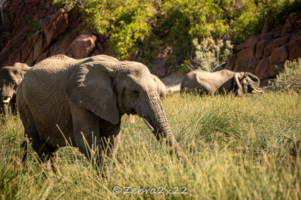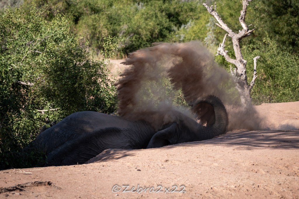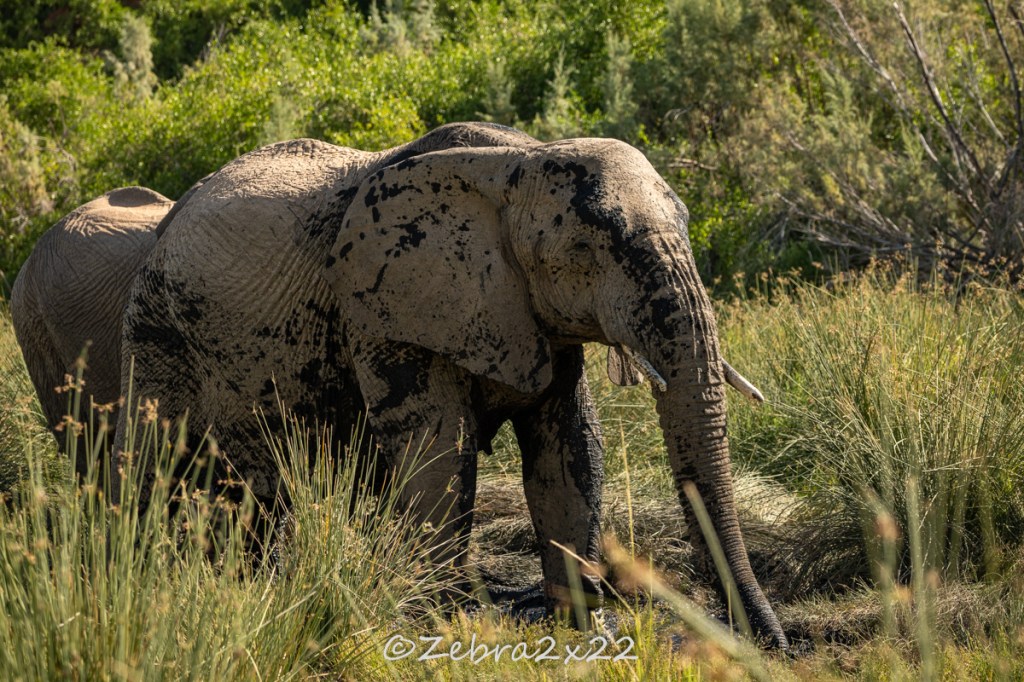We witnessed various interesting elephant behaviors: mud baths, digging water holes, nap times, feeding on roots, bark, and trees, young bulls playing, trumpeting, and more.