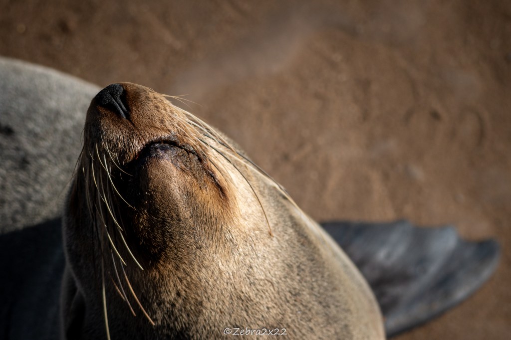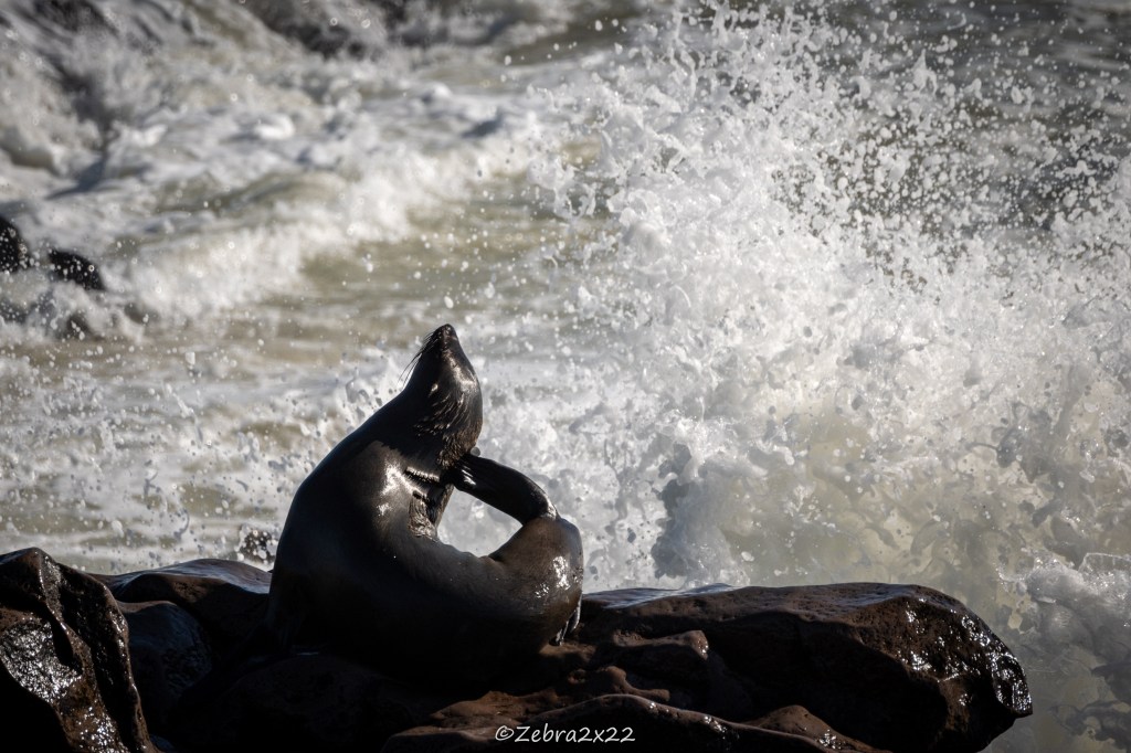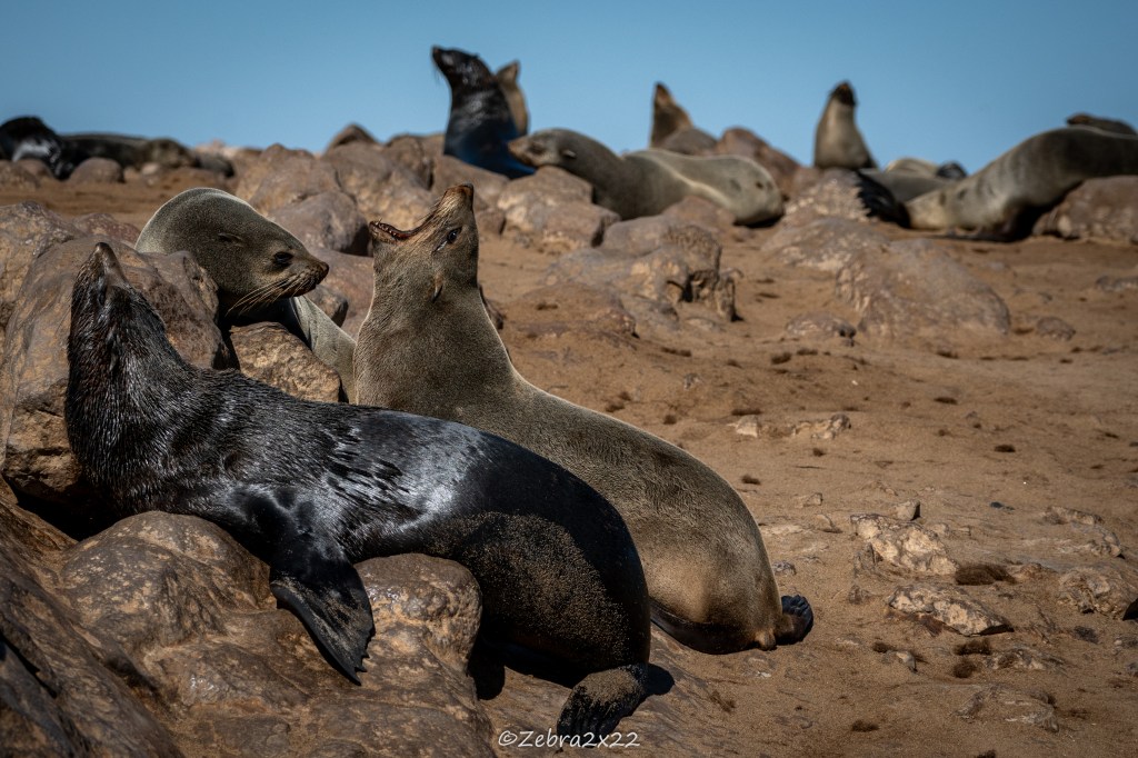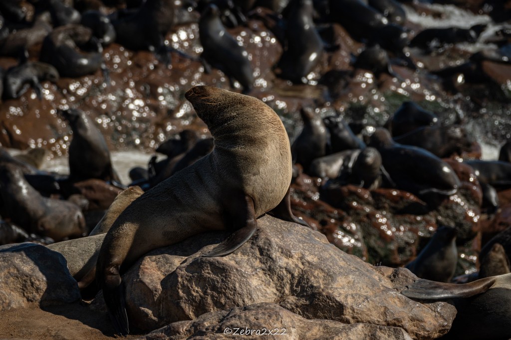 We headed to Cape Cross to observe the fur seal colony. They have more than 100,000 animals, possibly more than 400,000. The smell is strong, the area is busy, and the noise is intense. They communicate a lot using different calls to find their offspring, and there are many male displays and fights with other males to establish their territory and dominance. They fish, rest on the rocks, on the sand, and in the waves, enjoying shade or sun depending on their mood.